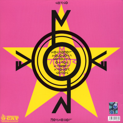 Schickes Teil, gelb-rosa wie beim Debüt der Sex Pistols, ein Stern wie bei der RAF, auf der Vorderseite aber auf den Kopf gestellt wie das Kreuz bei den Satanisten, und schrille Schrift wie bei … wie nur hier. Das kreuzförmige Konstrukt hat aber was von Sportschuhherstellerlogos.