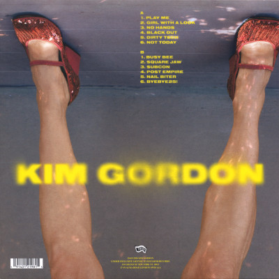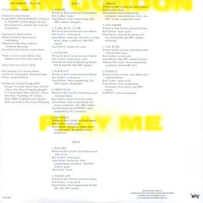 Von der Tochter hingegen hat sie sich die Schrift fürs Plattencover-Foto aufs Bein malen lassen. Steht auf der Innenhülle. Warum sich die Öffnung des Covers an der oberen Kante befindet, erschließt sich mir hingegen nicht. Mit dem verkehrtherummen Fotoausschnitt auf der Rückseite kann das eigentlich nichts zu tun haben. Oder sollte man das Cover ursprünglich aufklappen können? So als Starschnitt der unteren Hälfte von Rock-Ikone Kim Gordon?